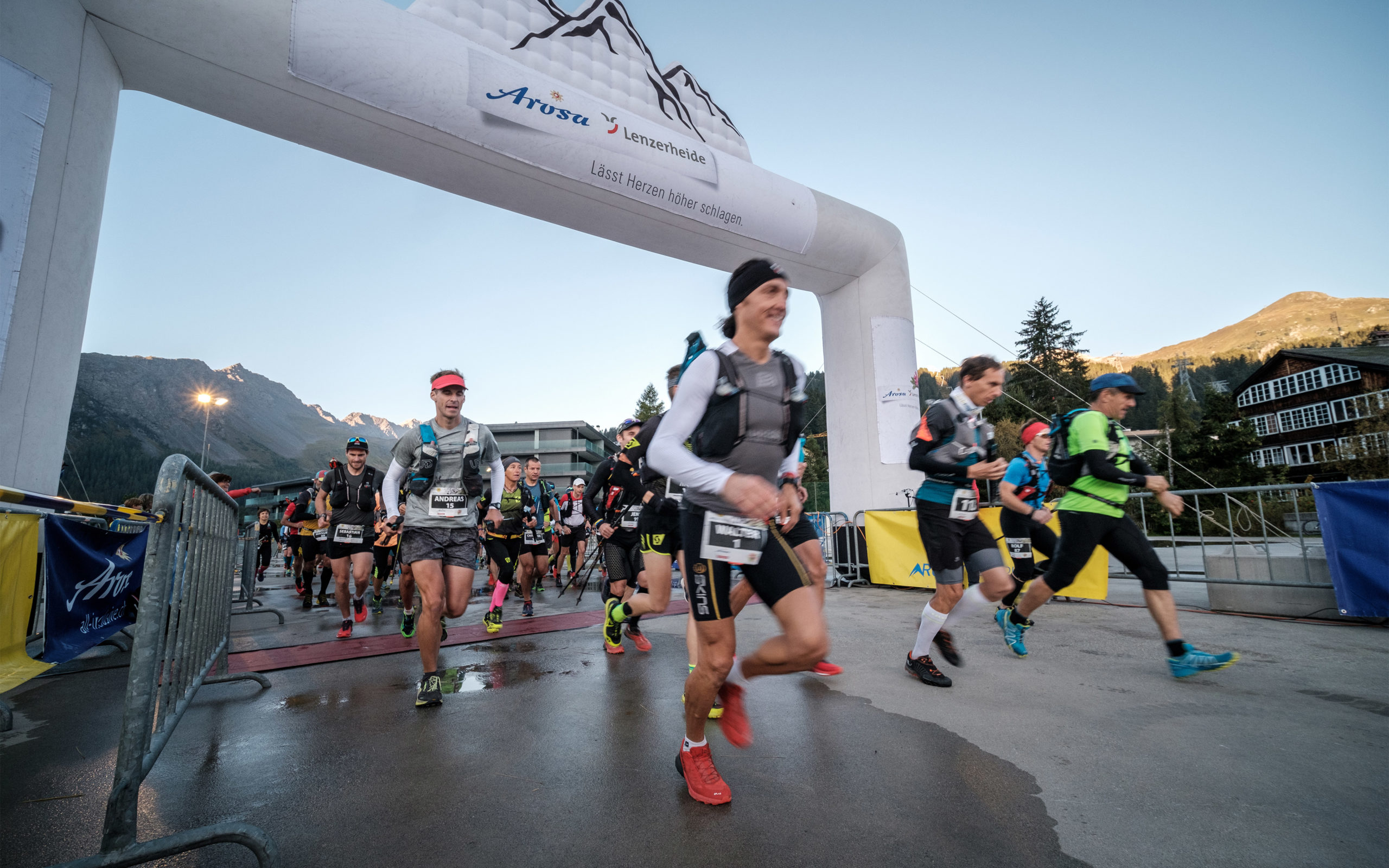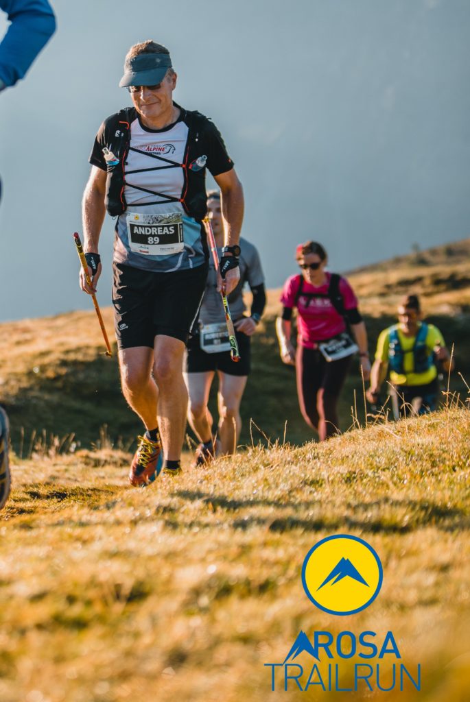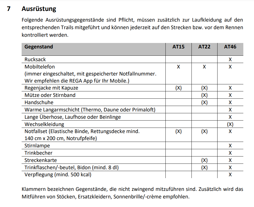 Mir als alter Bergsteiger machen die Trail-Läufe so sehr Spass, dass ich mich kurzentschlossen für den Arosa Trailrun AT46 anmelde. Warum der Lauf AT46 heisst, obwohl er eigentlich gute 54km lang ist, bleibt mir bis heute ein Rätsel. Ich vermute für den Veranstalter zählen die 8km Teerstrecke zwischen den Bergen nicht und so wird abgerundet. Bis jetzt habe ich nur ein paar einfachere Bergläufe in Strassenschuhen bestritten, wie z.B. den Jungfrau Marathon. Da geht’s im Pulk die Autobahn rauf, und bequem mit der Bahn runter. Der Arosa Trailrun ist eine neue, für mich unbekannte Liga: Die 3’400 Höhenmeter müssen nicht nur erklommen, sondern auch zu Fuss vernichtet werden. Zwischen den spärlichen Verpflegungsständen heisst es autonome Eigenverpflegung. Auch die obligatorische Pflichtausrüstung ist eindrücklich, und im Gegensatz zu den Waffenläufen, wo das Gepäck reine Folklore ist, auf dem Trail durchaus sinnvoll.