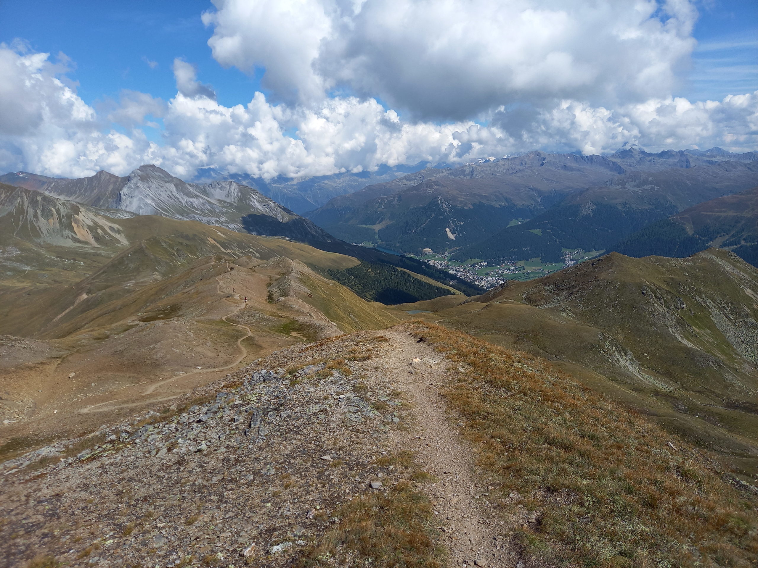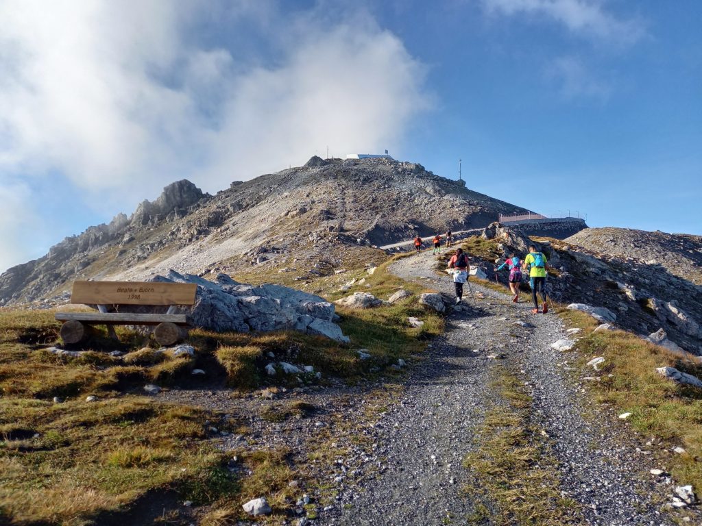 Das erste Ziel ist der Weisshorngipfel auf 2’624m, welcher nach 7.6 km Lauf bez. Gehdistanz erreicht ist. Nach diesen ersten 900 Höhenmeter zum Aufwärmen geht auch gleich wieder runter und rüber zum nächsten Berg, dem Hörnli. Ich geniesse die schöne Aussicht und mache wann immer ich Lust habe Fotos von der schönen Kulisse.