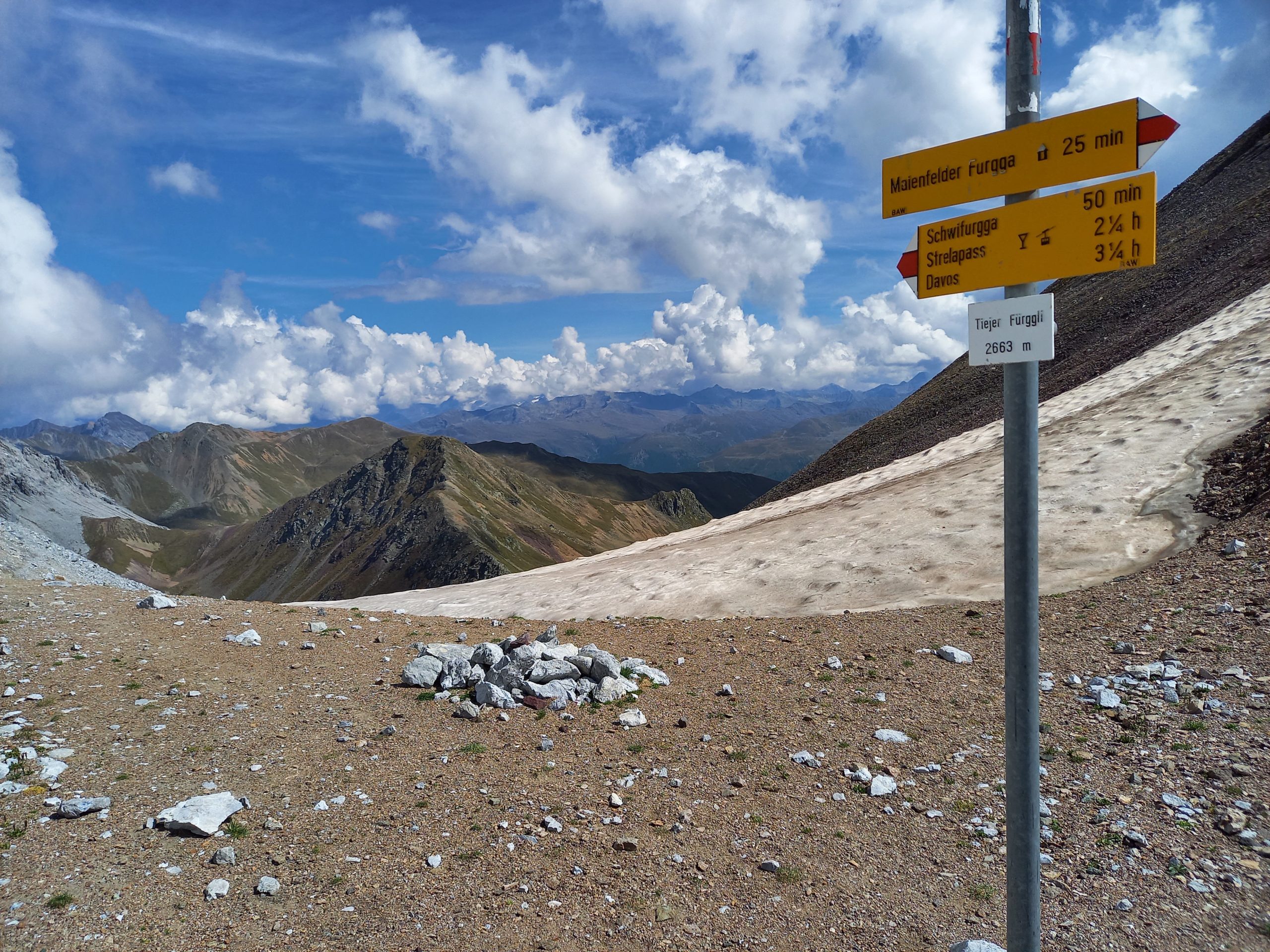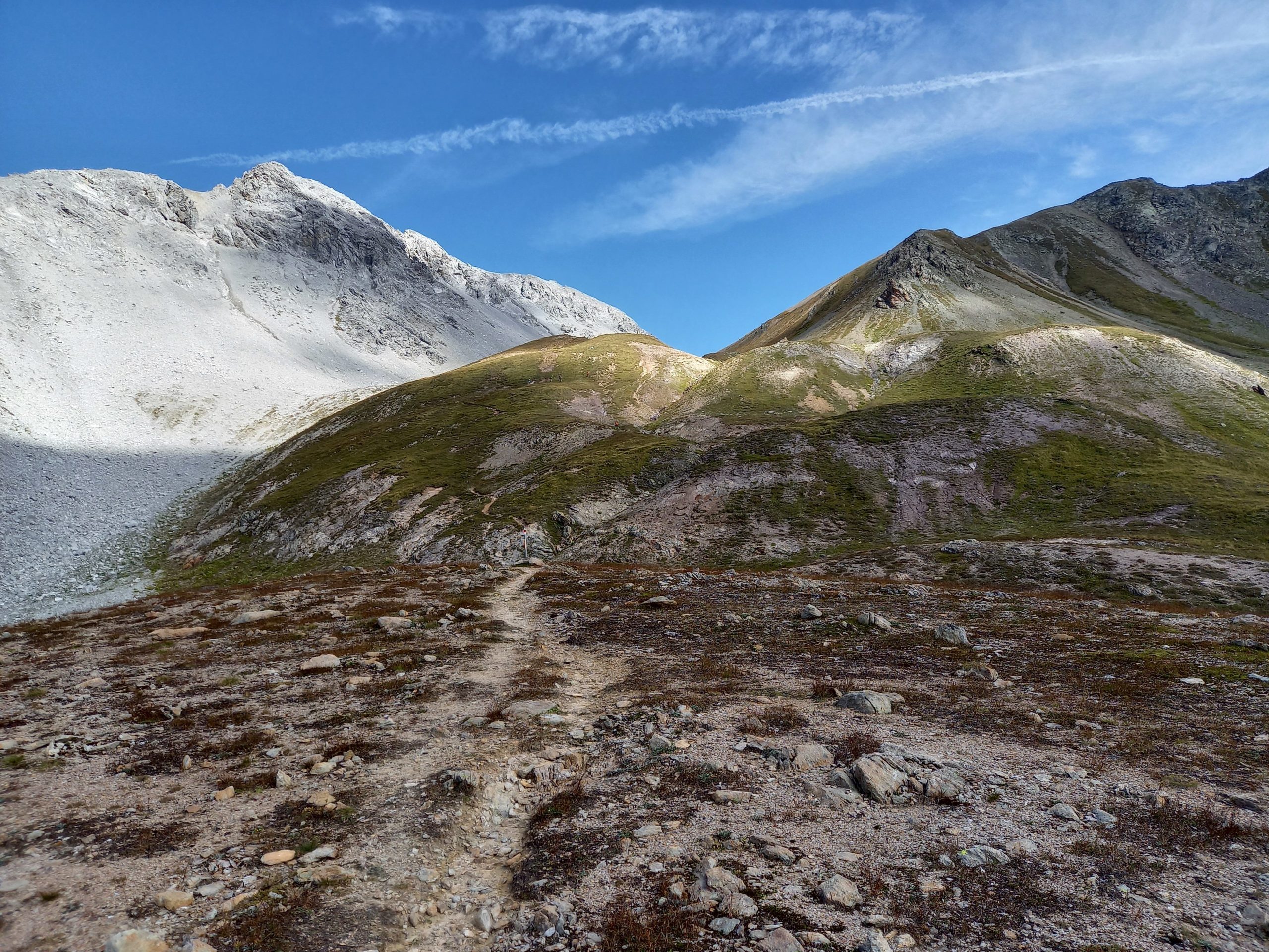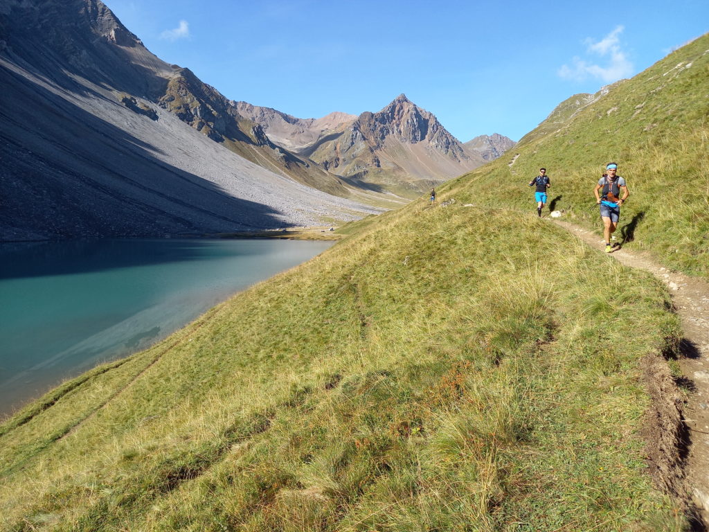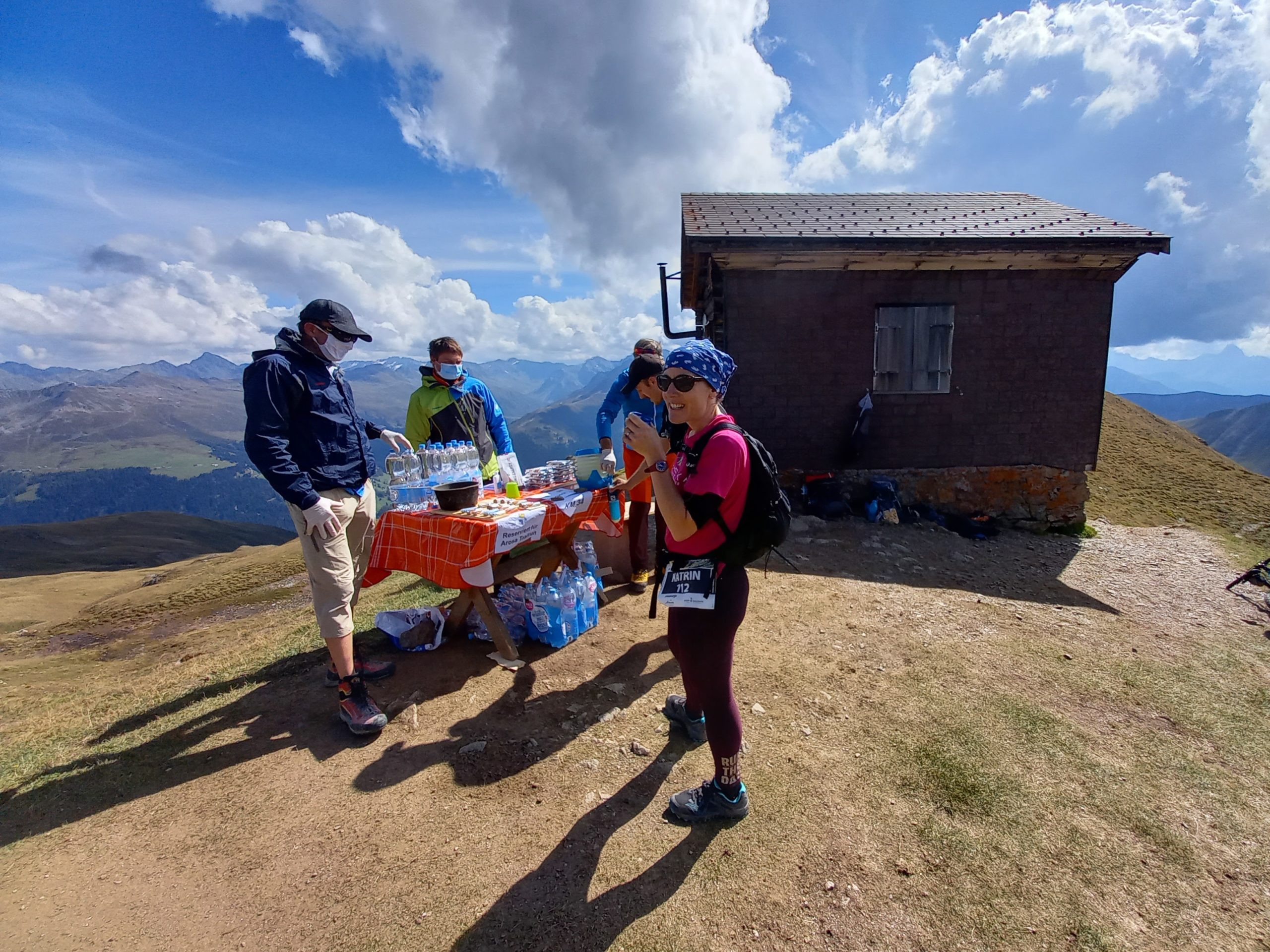 Der Weg geht um die Häuser durch Arosa, zu den Stauseen und weiter in die Pampa. Auch eine neue Erfahrung: Zwischen dem Verpflegungsposten und der Pampa laufe ich gefühlte 30min ganz alleine und sehe nirgends einen weiteren Läufer. Immer schön aufpassend, dass ich ja keine Wegmarke übersehe. Nun sind die nächsten rund 1000 Höhenmeter dran in Richtung Maienfelder Furgga. Dort steht der begehrteste Verpflegungsposten des heutigen Tages. Dieser ist so weit ab von jeglicher Zivilisation, dass der Posten am Morgen per Helikopter mit Personal und Wasser bestückt wird. 1h55min nach Arosa bei km30 erreiche ich diesen Kleinstposten, wo es limitiert pro Teilnehmer einen Liter der heiss begehrten Flüssigkeit gibt. Wie übrigens am jedem Posten wird penibel Teilnehmer Buchhaltung geführt, und jeder per Hand auf der Liste abgehakt. Sicherheitsmässig top, falls mal jemand unterwegs verloren geht, so wissen die Rettungskräfte wo mit der Suche beginnen. Mein Vorsprung zur Zeitlimite beträgt nun 104min. Also noch grüner als vorher; der Trend stimmt.