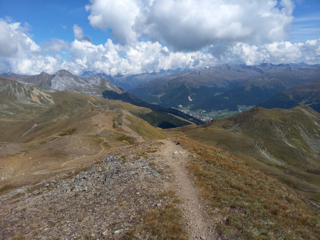 Nach der Hütte noch eine kleine Zusatzschlaufe zum Gipfel, und dann geht’s auf schönem Trail mehrheitlich höhehaltend und in Richtung Strelapass. Auf dieser rotweissen Bergwegpassage sind einige Wanderer und gelegentlich auch Biker unterwegs. Obwohl ich der Meinung bin, Biker seien auf Bergwegen fehl am Platz, klappt das Nebeneinander gut und beide Parteien nehmen Rücksicht aufeinander. Keine Regel ohne Ausnahme: So der gefühlte 10 Biker ist da anderer Meinung, und denkt wohl, Wanderwege gehören alleine den Biker und nicht dem Fussvolk. Vor mir sehe ich wie sich Wanderer mit einem Sprung zur Seite in Deckung begehen, wegen des besagten Rowdy-Bikers. Danach fährt er mit geschätzten 20 km/h auf mich zu und macht keine Anstalten an seiner Fahrweise etwas zu ändern. Nach gut 7h Laufzeit bin ich so richtig im Saft, mit Adrenalin geladen bis über beide Ohren, und freue mich über jede Abwechslung. Ich trabe demonstrativ auf dem Wanderweg weiter, während er mich voll anfährt. Schade kommt er nicht zu Fall, ich hätte es ihm gegönnt. Er ruft mir schöne Wörter nach die mit Ar… beginnen zu. Ich drehe mich nicht einmal um und sage kein Wort, ich grinse nur auf den Stockzähnen. Ich freue mich über die 8 Jahren Karate, die mir einen sicheren Stand bescherten, und geniesse weiterhin die schöne Natur.