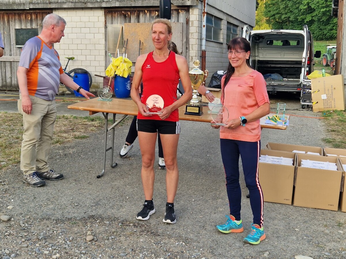 Die 9,2 Kilometer sind schnell geschafft und im Ziel sind alle nass, sei es von einer zweiten Dusche unter dem Schlauch oder durchgeschwitzt. Jetzt schnell zurück zur Turnhalle, eine kühle Dusche, dann zur Rangverkündigung, um den Pokal und hoffentlich ein Sack voller Goodies zu holen. Bravo Christine, du hast unsere Ehre gerettet mit dem 2. Platz! Für einen Gruppenpreis hat es dieses Jahr nicht gereicht, es waren wohl alle mit den Gedanken schon bei den Fischknusperli und dem kühlen Bier. Oder vielleicht haben sie uns letztes Jahr erwischt, wie wir bereits im Ziel die Sachen aus den Säcken untereinander getauscht haben: Eine Vegi-Bouillon gegen eine Pilzsauce austauschen, die Bratensauce hat dem einen nicht gepasst, die andere wollte die Spargelsuppe lieber nicht in dieser Form.