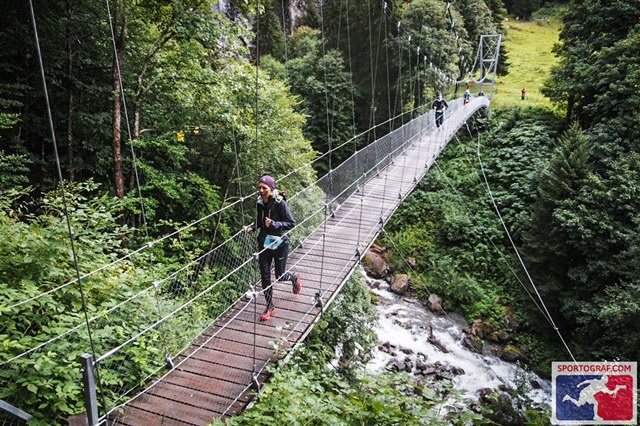 Die Strecke führte uns anfangs gemächlich steigend über eine Hängebrücke nach Monbiel. Danach wurde der Weg sehr steil und ich konnte meine Trailstöcke das erste Mal gebrauchen. Bis zum ersten Verpflegungsposten waren die Wege angenehm zu laufen. Der erste technisch sehr anspruchsvolle Teil folgte mit dem Abstieg nach Klosters Dorf. Der Singlepfand zum Schlappintobel war sehr steil, mit Wurzeln und Steinen übersäht und rutschig. Wer ängstlich war, hatte eine schwierige Passage zu bestreiten. Martina ist technisch sehr versiert. Ich konnte mich ihr anschliessen auf diesem auch für mich sehr herausfordernden Teilstück.