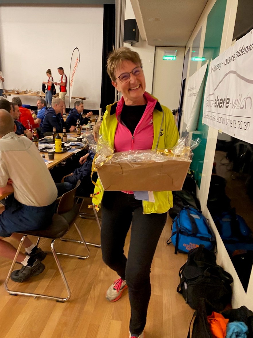 Die ersten drei bekamen eine Blume. Dazu gab es noch 10 Früchtekörbe. Diese wurden unter den Anwesenden Läufern verlost. Hier hatte unsere Präsidentin Glück: